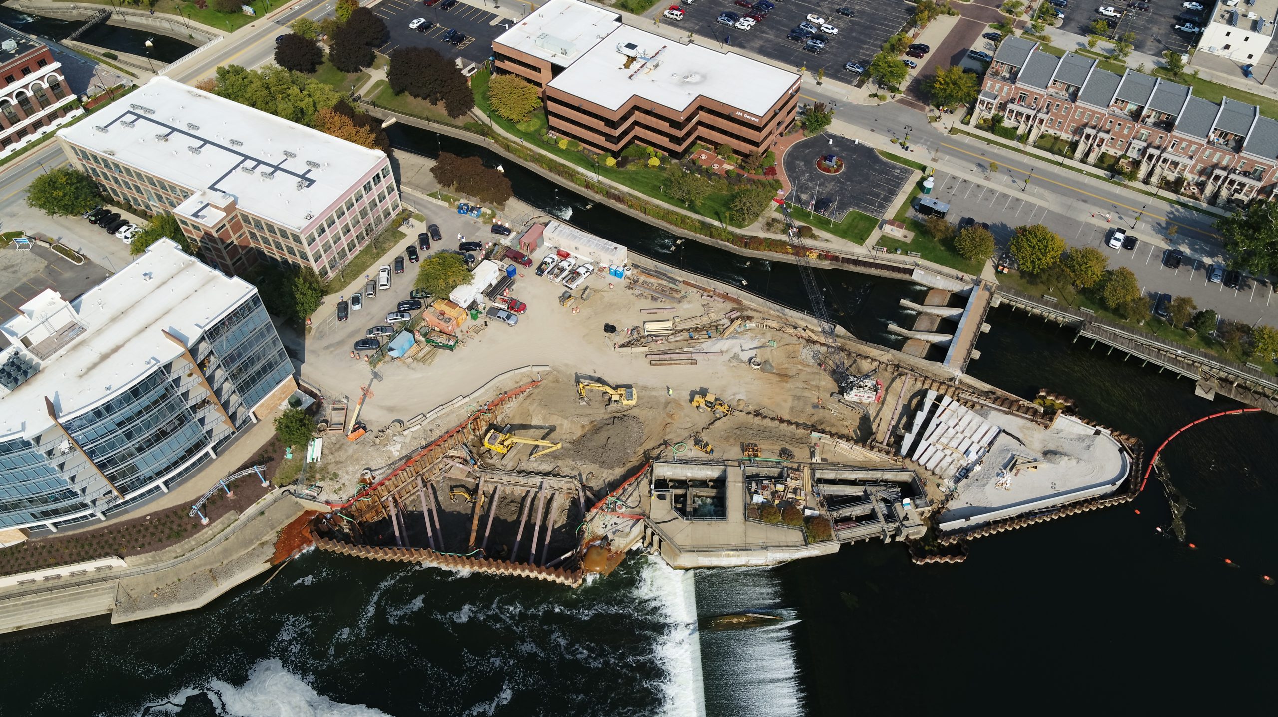 The project has a 50’ deep excavation adjacent to a run-of-river dam that is completely covered. A new city park was developed by the City of South Bend on top of a drivable structure provided in KFI’s design.